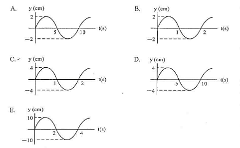 Balok yang terkait dengan pegas dan ditarik sejauh 4 cm, kemudian dilepaskan sehingga sistem bergetar harmonik. Dalam waktu 10 sekon terjadi 5 getaran, maka grafik hubungan simpangan dengan waktu getar adalah…